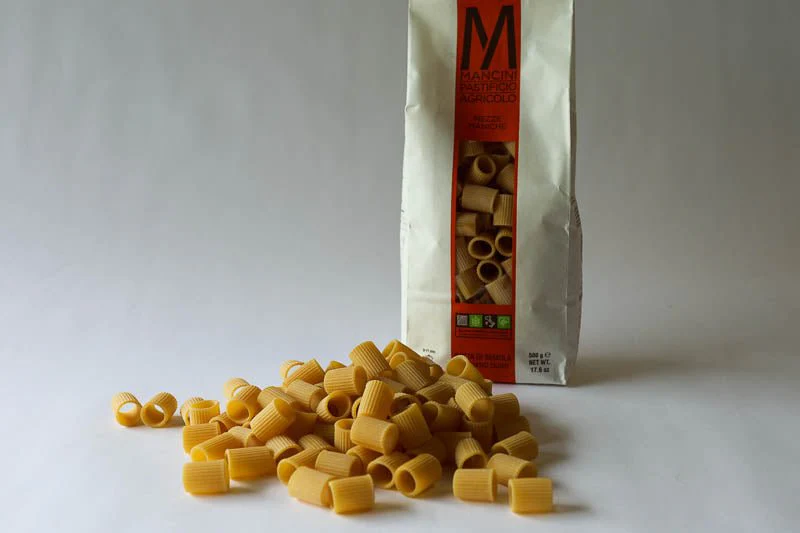 Mancini uses circular bronze die plates and dries the Mezze Maniche at temperatures between min. 36°C and max 55°C, taking 22 hours. The result is premium pasta ready for a little butter and cheese or your most elaborate sauces. We tend to like them for pasta e fagioli!